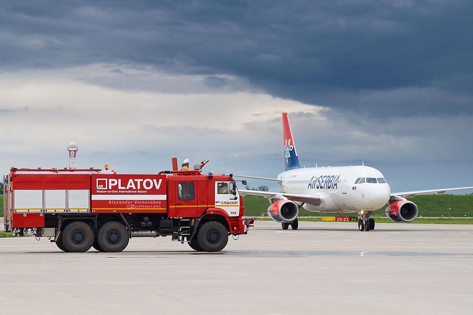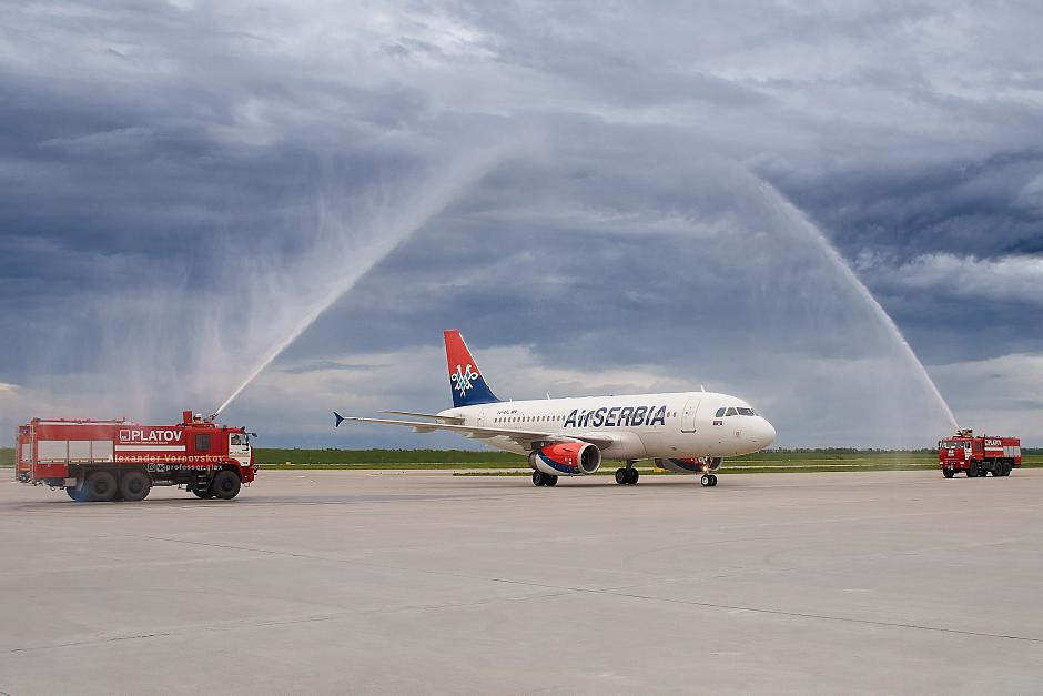 AirSerbia is a new carrier for the Platov Airport and Belgrade is a new destination. As per the existing aviation tradition, the new flight was welcomed at Platov with a water arch formed by jets of water from the hoses of fire engines.