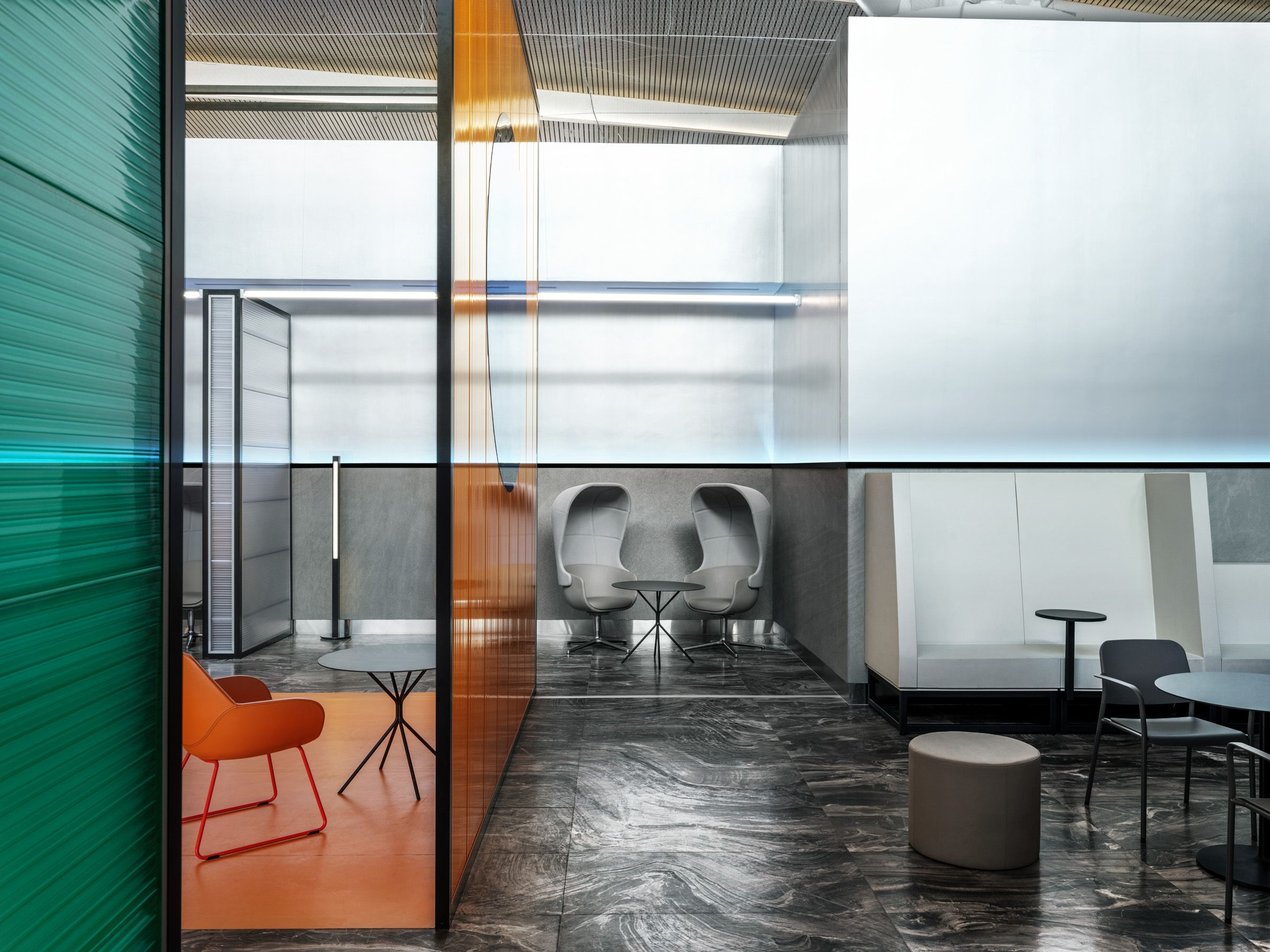 При разработке планировочного решения зал разбили на несколько функциональных зон, где посетители могут либо уединиться, глядя в окно, либо посидеть в компании.