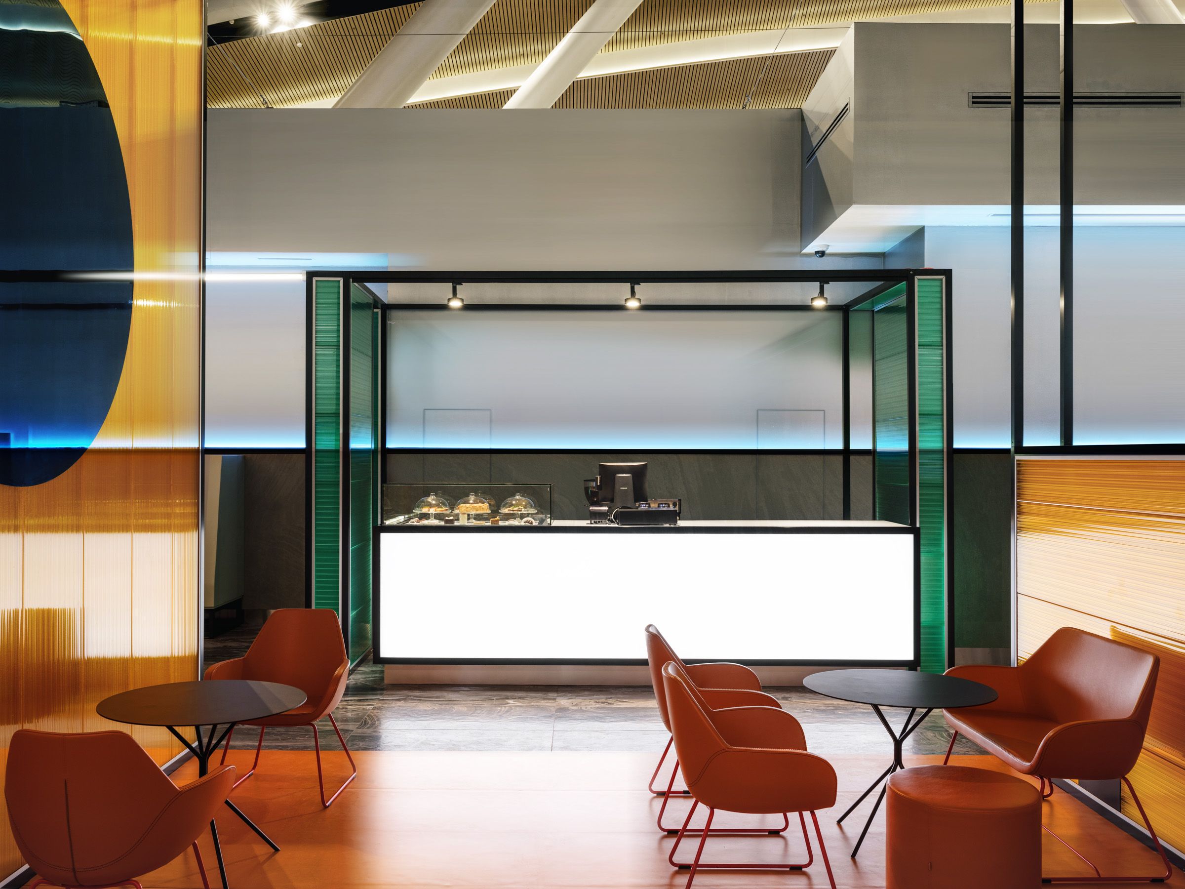 Кроме ленты и стебельков-колонн в проекте много вертикалей, поддерживающих графичность и прозрачность образа: "ножки" стоек бара и информации и маленькие чёрные кофейные столики, и широкие кресла на подиуме из реек.